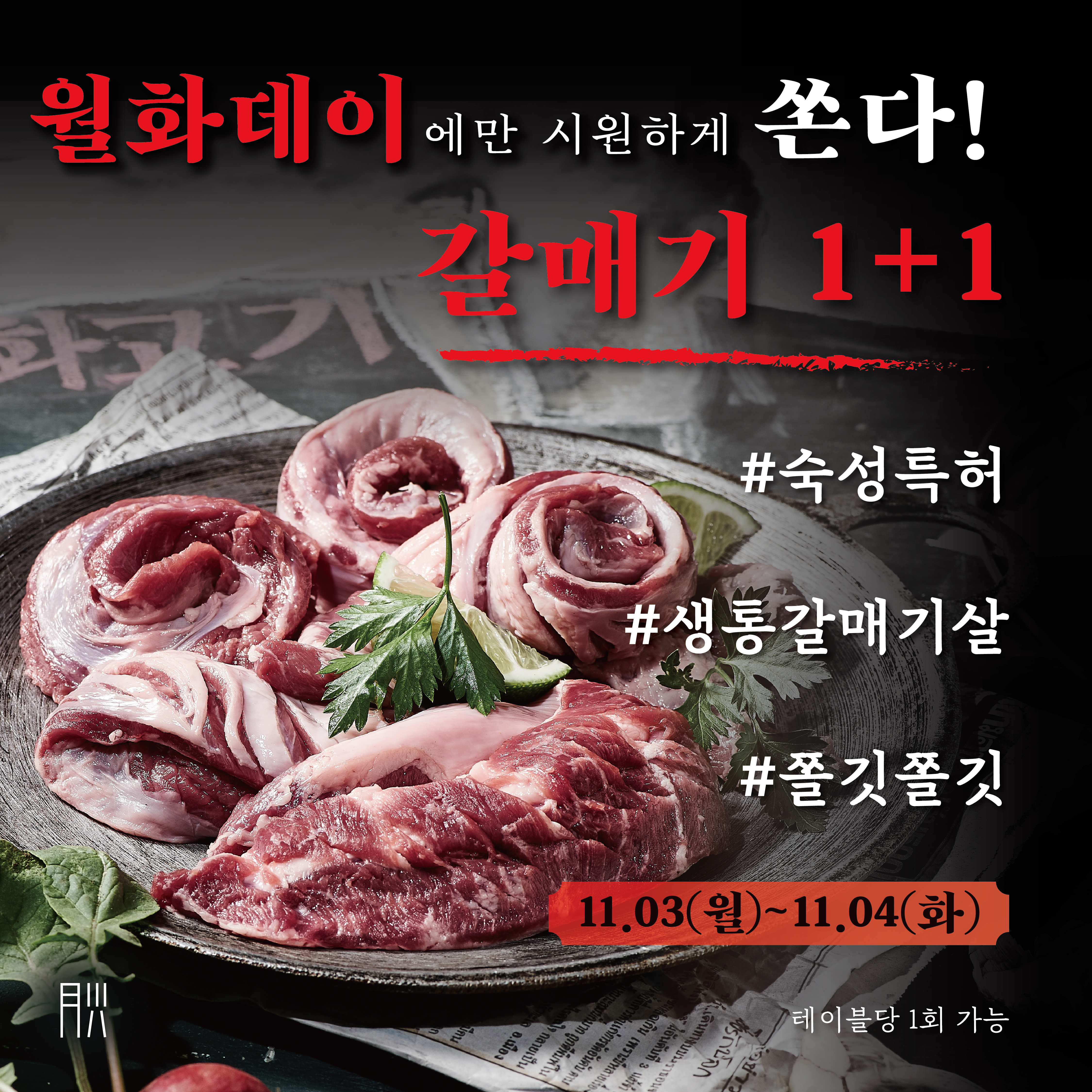 이번 11월에는 숙성특허 생통갈매기살 1+1 이벤트로 찾아왔습니다.